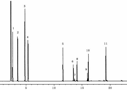 1. 苯 2.甲苯 3.间二甲苯 4.邻二甲苯 5.正十四烷 6.甲苯二异氰酸酯(I)7. 甲苯二异氰酸酯(II)9.己二异氰酸酯 10.异佛尔酮二异氰酸酯(I)11. 异佛尔酮二异氰酸酯(II) 12.二苯丁烷二异氰酸酯